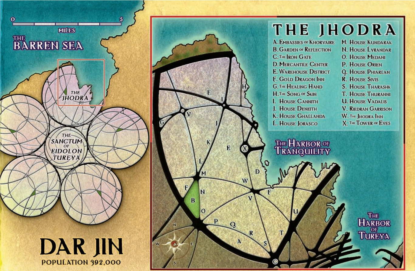 Dar Jin is located in the Corvagura province on the eastern coast of Sarlona, bordering the Barren Sea.[3][5] The city is divided into six districts or wards, with five shaped like perfect circles surrounding the city's central fortress sanctum.[3][1]