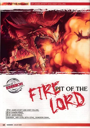 "Pit of the Fire Lord" is an Eberron adventure designed for four 8th-level characters, scalable for levels 6–9. This adventure is the final part of the Shards of Eberron Campaign Arc, which originally appeared as the D&D Open adventure at Gen Con Indy 2004. While the story follows "Crypt of the Crimson Starts" in Dungeon #123 and "Temple of the Scorpion God" in Dungeon #124, it is also easy to run as a stand-alone adventure.