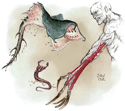 A symbiont can exist on its own for a length of time; however, it will seek a host as soon as one becomes available. In the hands of those other than the daelkyr and their followers, the symbiont's alien mind will often clash with that of its host, acting unpredictably or even attempting to take control of its host.[1][2] Only those with strong wills can overcome the mental invasion of the symbiont. Once the symbiont is subdued the first time, the symbiont will usually act cowed, subjecting itself to the host's wishes. However, the symbiont may try to take over its host's mind again if the host is especially weakened, or if the host tries to do something not in the best interest of the symbiont, like remove it or attack another symbiont. When the symbiont gains dominance, the symbiont is in full control of the host's actions, though it usually becomes apparent that the host is no longer in control of his or her body. Even in a cowed state, the symbiont may subtly influence its host, fanning the fires of rage or increasing a host's hunger for its own nourishment. Some hosts can be driven mad by the constant whispering of a symbiont in its mind.[1][8]