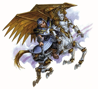 The zelekhut looks much like a mechanical or clockwork centaur, but with skin as white as alabaster and clad in golden plate armor. A pair of golden metallic wings can unfold from its back when needed.[1][2] Its voice is said to be as solemn as a judge's gavel.[5]